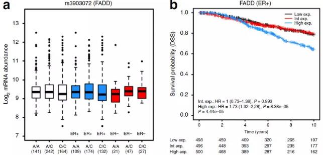 作者所納入的風險SNP在此之前只有一個位點(16q12.1-rs3803662)報道了與疾病預后相關。本研究中作者直接分析了代謝型乳腺癌隊列中潛在的靶基因的表達水平與的患者預后之間的關聯(分別對ER +和ER-亞組進行生存分析)。其中32個靶基因(33%)與ER +乳腺癌患者的DSS相關,6個DSS相關的靶基因為eQTL靶基因。