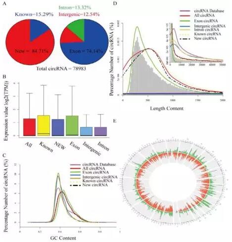 所有circRNA和外顯子circRNA的GC含量高于circRNA數據庫,但內含子和基因間區circRNA的GC含量與circRNA數據庫中相似(圖2c)。此外,circRNA長度的峰值主要集中在558 bp區域,而在數據庫中circRNA的峰值則集中在4105 bp區域。新circRNA與已知的circRNA長度具有相似的特征,表明新circRNA數據是可靠的(圖2d)。圖2e顯示了circRNA在人類染色體上的基因分布,circRNA也廣泛分布于所有的染色體中,但在Y染色體和著絲粒上的分布較少,在每條染色體的染色體臂兩端有較高的分布。
