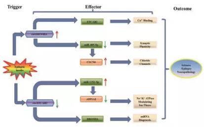 最近的基因組學研究揭示了許多與各種疾病的基因調控相關的非編碼RNA (ncRNAs)。人類癲癇中非編碼RNA的表達也發生了改變,可以作為一種新的、非侵入性的生物標志物來改善目前的癲癇診斷。環狀RNA (circRNAs)是一種獨特的非編碼環狀RNA,circRNA與microRNAs (miRNAs)相互作用,并作為miRNA海綿,通過circRNA-miRNA-mRNA網絡在神經系統疾病中調節基因表達。研究表明環狀RNA在神經元功能中發揮重要作用,尤其是在突觸中。組織學研究結果證實,邊緣系統的突觸重組似乎能逐漸增強皮質興奮性,并可能導致癲癇發作。然而,circRNAs在癲癇中的作用仍是未知的。