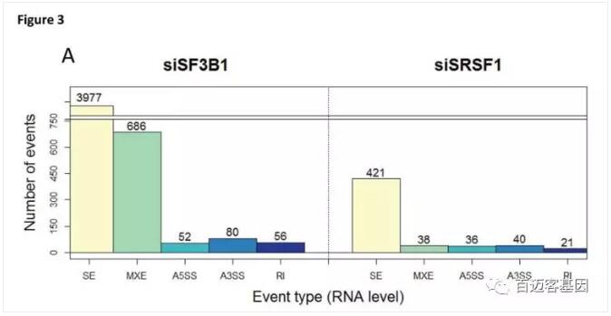 轉錄組分析顯示siSF3B1和siSRSF1的可變剪接事件與對照組相比有顯著差異(圖3A),證明對剪接因子的操作導致了差異剪接的產生。