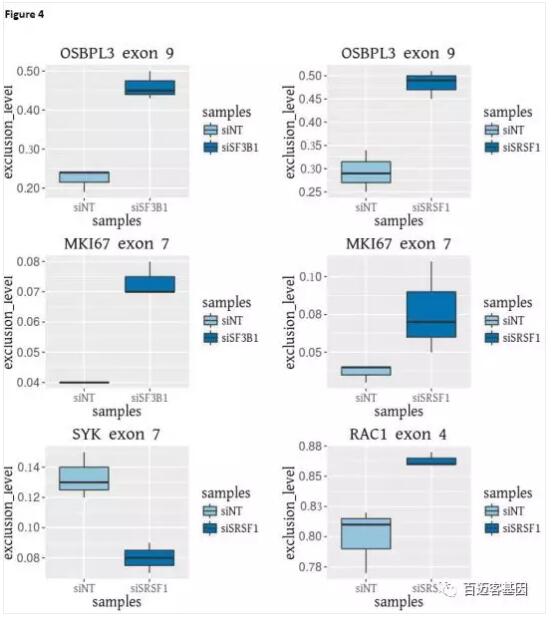 為了進一步驗證,作者選擇了4個外顯子跳躍事件進行RT-qPCR驗證,包括SYK exon 7, RAC1 exon 4, OSBPL3 exon 9, MKI67 exon 7(如圖4所示)。根據RNA-seq分析,所有的事件在SRSF1下調后都發生了差異剪接,而OSBPL3和MKI67則受SF3B1下調的影響。