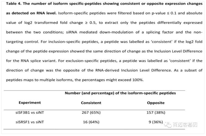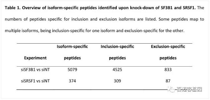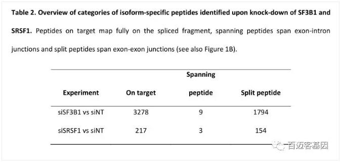 肽段數量上的差別直接和兩個實驗剪接isoform數據庫的數目相關。總的來說,大約60%的isoform特異肽段會比對到目標區域,跨越exon-econ junction的split 肽段約占40%,跨越 exon-intron junctions 的spanning肽段則很少被發現(如表2所示)。