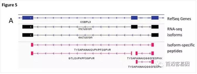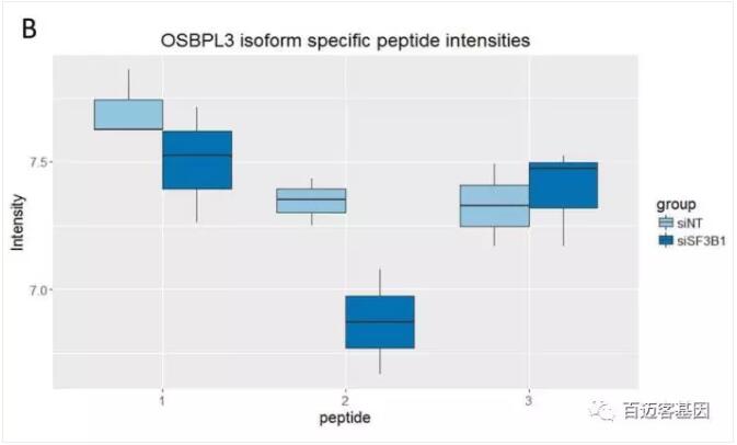 約65%的顯著差異表達的splice-specific-peptides在RNA水平上表現出一致的表達差異。例如,下調SF3B1的實驗組中,OSBPL3 9號外顯子中分別有3個支持外顯子保留和1個支持外顯子去除的peptides被鑒定出來。兩種inclusion specific-peptides表達明顯較低,而exclusion specific -peptides則與對照相比表現出較高的表達量(如圖5所示)。