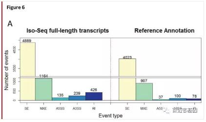 通過Iso-Seq得的轉錄本替代人基因組注釋被用作轉錄組變異的來源進行定性分析,同時可以通過對較短但更高密度的reads來進行定量分析。在RNA水平上,在每種剪接事件中,使用Iso-Seq數據確定的顯著差異的isoforms數量超過了使用參考基因組注釋法的結果(如圖6A所示)。