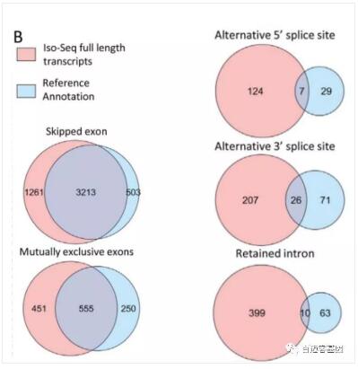 在研究可變剪接方面,Iso-Seq測到的全長轉錄本對基因組注釋結果是一個極大補充,尤其在內含子保留、3 ‘可變剪接和5 ‘端可變剪接事件中,Iso-Seq測到的全長轉錄本與基因組注釋的重疊較小。這表明,基因組注釋中缺少一些完整的或部分的內含子序列可變剪接的isoform形式。