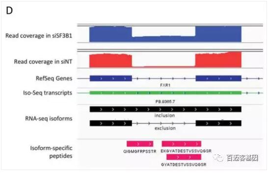 例如,全長轉錄本進行測序結果支持FXR1內含子保留的三種肽段,因此這種內含子保留事件也存在于注釋文件中。Illumina 測到的短 reads支持這一事件,并提供了定量的證據,表明它在SF3B1的下調過程中比其對照組(圖6D)更高表達。