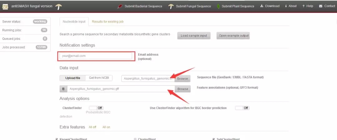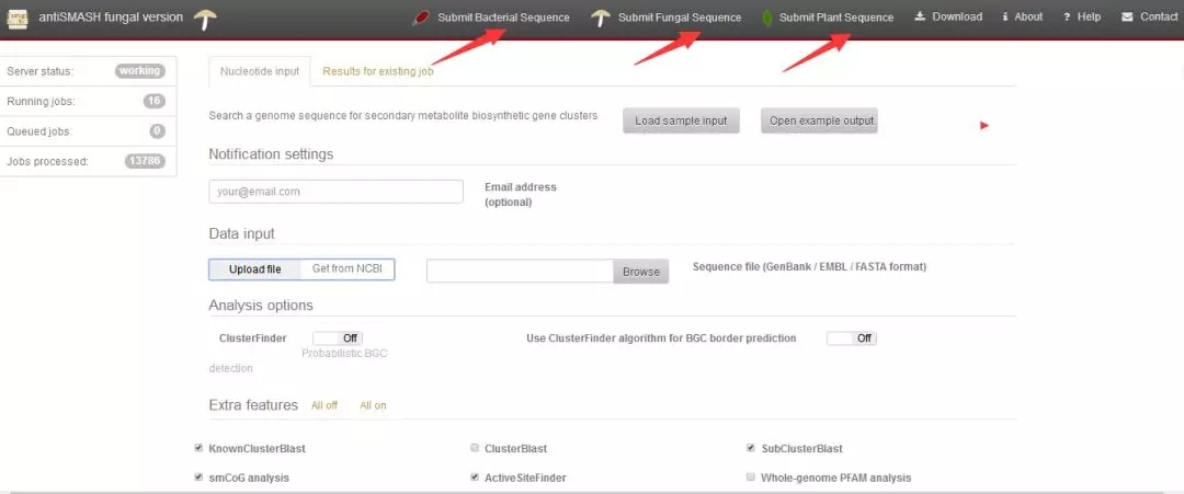 1.次級代謝產物預測網址:https://fungismash.secondarymetabolites.org ,點擊進入界面,可進行細菌、真菌以及植物次級代謝產物預測;