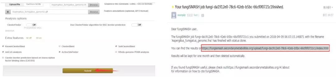 3.其他參數默認,點擊“submit”申請次級代謝產物預測結果,大約12h內,系統運行結束后,預留郵件會收到預測結果;