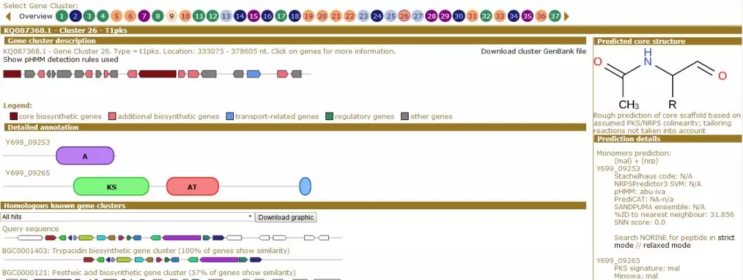 5.點擊所關注的基因簇,可獲該基因簇的詳細信息,包括基因簇基因組成,核心基因的功能域組成以及與已知基因簇間共線性展示結果等;