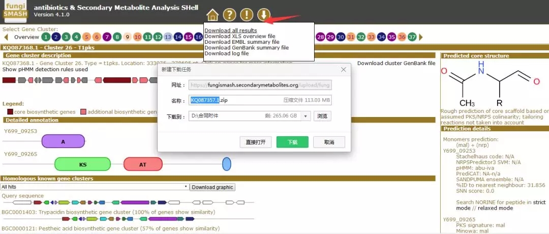 4.進入預留郵箱查看預測結果,打開預測結果網址即可查看結果,包含基因簇序列編號,次級代謝產物類型,基因簇所在位置,與已知次級代謝基因簇的結果比對等;