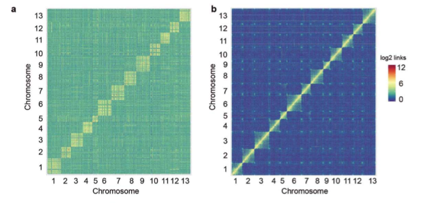 a. Hi-C數據與亞洲棉原基因組比對;b. Hi-C數據與亞洲棉更新基因組比對