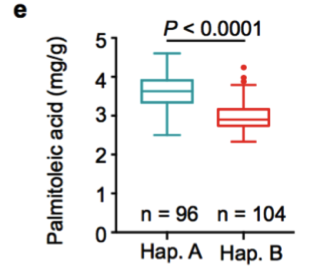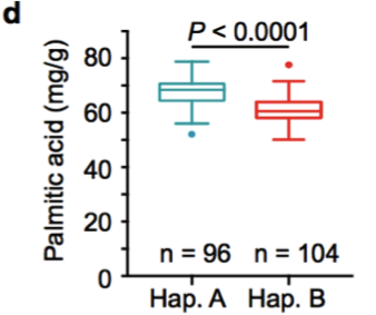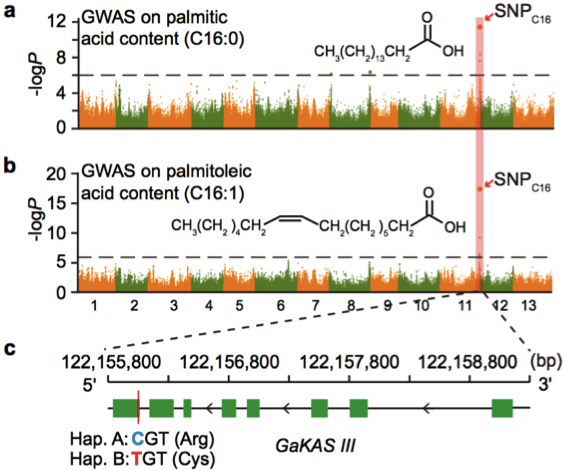 a. 棕櫚酸含量的GWAS關聯分析;b. 棕櫚油酸的GWAS關聯分析;c. GaKASIII基因的變異(Arg/Cys);d-e. Hap. A和Hap. B中棕櫚酸和棕櫚油酸含量比較
