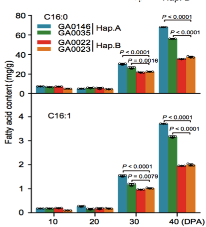 圖10 在棉花生長發育過程中C16:0和C16:1脂肪酸含量分析(Hap. A和Hap. B)