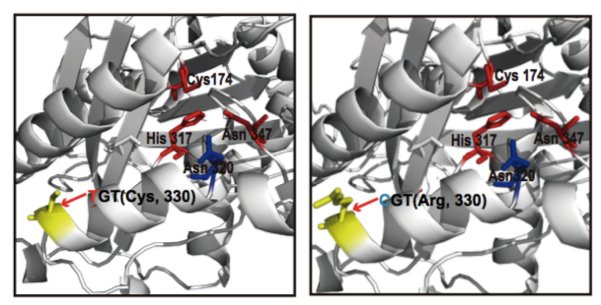 (1)脂肪酸含量相關基因的定位與研究 棉花是世界上第六大植物油來源,通過GWAS關聯分析,在11號染色體上的GaKASIII基因組座位上(Ga11G3851)的第8個外顯子區獲得了1個顯著的SNP位點,該基因編碼3-Oxoacyl-[acyl-carrier-protein ACP] synthase III(3-氧酰基-[酰載體蛋白]合酶III),如圖8 a-c,KASIII基因編碼的這一關鍵酶可以使得脂肪酸鏈從C2到C4延伸,并最終確定種子中棕櫚酸(C16:0)和棕櫚油酸(C16:1)的組成。GaKASIII基因的多態性導致了保守的ACP_synthase_III_(酰載體蛋白合酶III)結構域中半胱氨酸/精氨酸間的置換(圖8 c),單倍型B(TGT,Cys)主要出現在低含油量種質中,而在高含油量種質中發現單倍型A(CGT,Arg)(圖8 d-e)。GaKASIII基因在開花后(DPA)的30天表達量最高(圖9),這是種子油量積累的關鍵階段,在單倍型種質A中,C16:0和C16:1含量以顯著的速率累積(圖10);蛋白質結構模型預測顯示,半胱氨酸/精氨酸殘基位于α螺旋處,該位點靠近酶活性位點,同時是輔酶A(CoA)結合位點(圖11)。