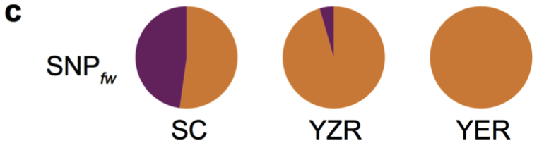 人工選擇在農作物的馴化和遷徙的過程中具有重要的作用。群體結構分析顯示當K=4時,YER與SC和YZR明顯不同(圖4 b,K=4)。通過兩兩群體間(SC vs. YZR, SC vs. YER, YZR vs. YER)的選擇性清除分析(FST)鑒定出了分別覆蓋到3,162,2,879和3,308個基因上的59,53和51個顯著遺傳分化的區域。SC和YZR之間的21個分化的區域(約43.5 Mb 含有915個基因)在群體SC和YER之間是保守的(圖7 a)。