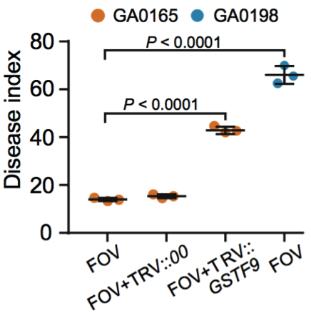 圖15 不同植株處理后的疾病感染指數比較(GA00198,GA0165,TRV::00和TRV::GSTF9,處理條件:接種FOV)