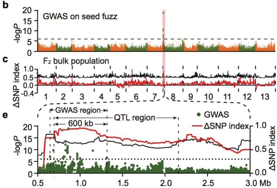 a 亞洲棉種子有絨(左)和無絨(右)表型;b GWAS關聯分析;c F2群體QTL分析;d F2群體的構建 e GWAS和QTL聯合分析