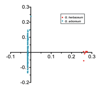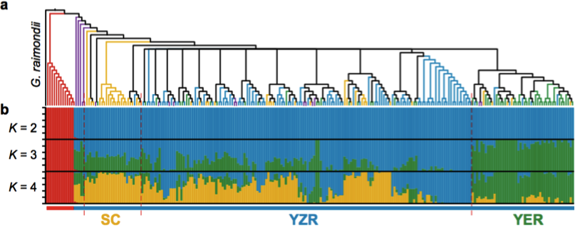 以雷蒙德氏棉(G. raimondii)為外群,利用72,419個SNPs構建系統發育樹,顯示:G. herbaceum(草棉)和G. arboretum(亞洲棉)聚類成2個獨立的群(圖4 a-b)。G. arboretum(亞洲棉)進一步又分為SC,YZR和YER三個群,顯示了地理分布模式的差異,進而利用PCA分析支持這一結果(圖4 c)。同時發現了亞洲棉和草棉是由不同的祖先種馴化而形成。