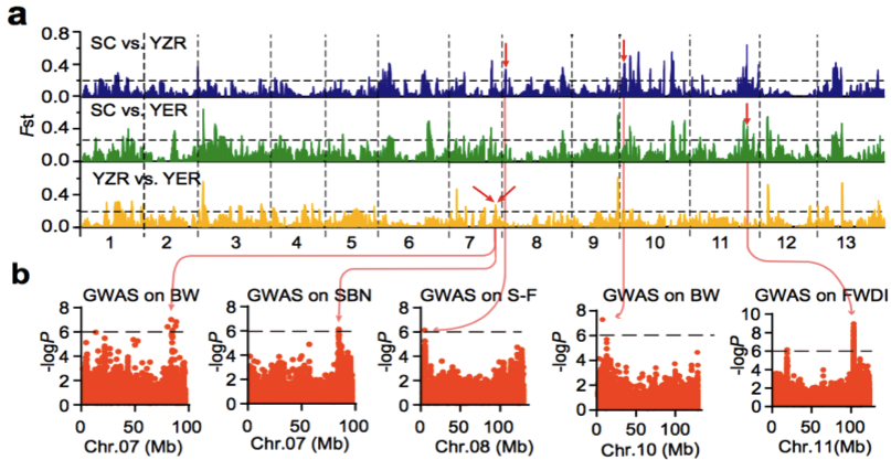 圖7 a. 亞洲棉SC,YZR和YER的選擇性清除分析;b. 全基因組關聯分析
