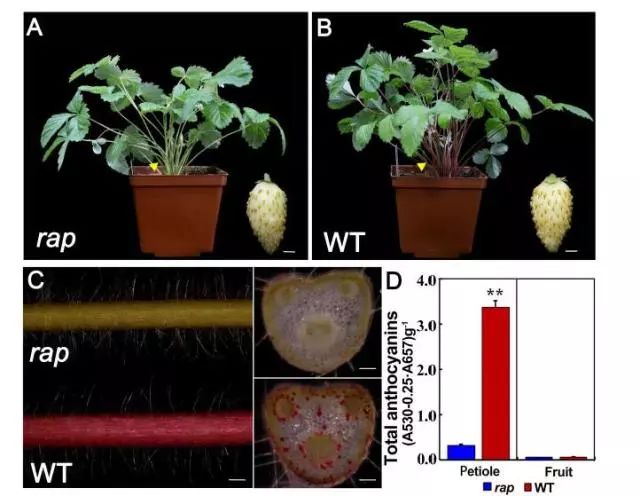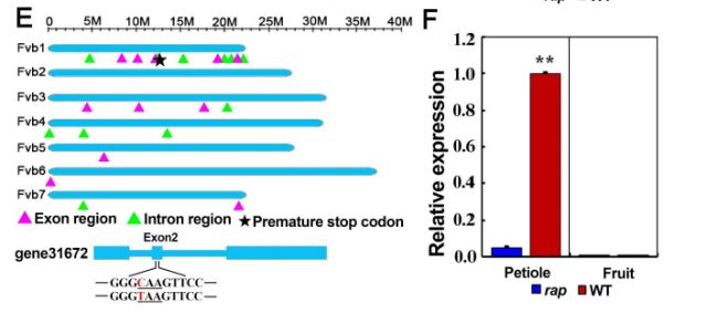 作者利用ENU誘變產(chǎn)生了綠色葉柄和葉片的突變體rap,相較與野生型YW5AF7,rap表皮細胞的色素沉著大大減少,葉柄的橫截面脈管系統(tǒng)周圍皮層細胞中顯示出相同的變化,且與色素減少表型相一致的是rap葉片葉柄中總花青素含量顯著降低(P <0.01),rap和YW5AF7對照果實中花青素含量都極低(圖1)。通過對已知花青素合成途徑相關基因表達及測序分析,RAP為一新基因參與花青素的積累,調控草莓的生長發(fā)育。
