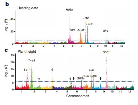 作者通過對1495份雜交稻品種材料中17套代表性雜交稻產生的10074 F2遺傳群體進行基因組測序和田間產量性狀考察,綜合QTL定位及GWAS分析,鑒定出了控制水稻雜種優勢的主要基因位點HD3a、TAC1、LAX1、Ghd8等 。進一步研究表明,水稻中雜種優勢的表現正是由這些基因位點所決定,在雜交配組中,這些基因位點產生了全新的基因型組合,在雜交一代中高效地實現了對水稻花期、株型、產量各要素的理想搭配。