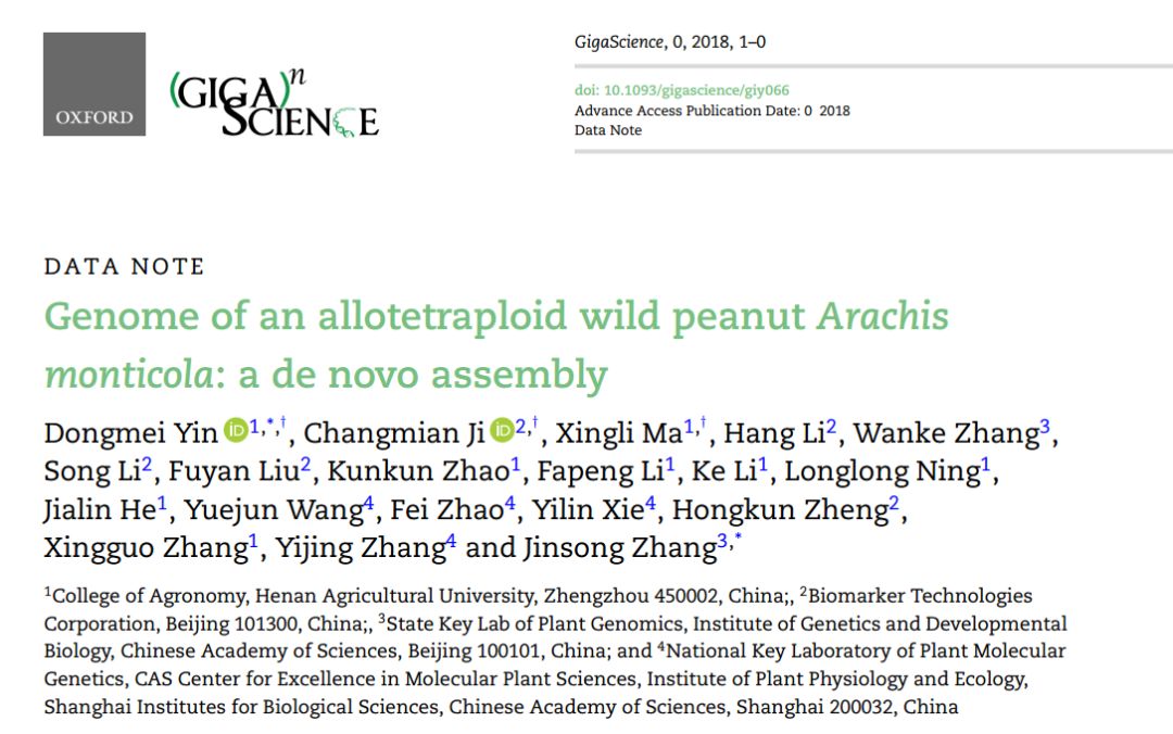 花生作為我國(guó)重要的經(jīng)濟(jì)作物,廣泛種植于熱帶和亞熱帶地區(qū),是提供重要的蛋白和油料的基礎(chǔ)。作為豆科的重要分支之一,花生屬一共包括30個(gè)二倍體品種,1個(gè)異源四倍體野生花生(A.monticola)和1個(gè)異源四倍體栽培花生(A.hypogaea)(2n = 4x = 40)。作為栽培花生農(nóng)藝性狀改良的重要野生資源供體,野生四倍體花生的基因組也一直是國(guó)內(nèi)外學(xué)者的研究熱點(diǎn)。成功破譯四倍體野生花生的基因組有助于科學(xué)家和育種專(zhuān)家對(duì)A.hypogaea起源及馴化過(guò)程的理解。河南農(nóng)業(yè)大學(xué)殷冬梅教授團(tuán)隊(duì)與北京百邁客生物科技有限公司、中國(guó)科學(xué)院等多家單位聯(lián)合攻關(guān),成功破譯復(fù)雜的異源四倍體野生花生基因組密碼,相關(guān)成果于2018年6月19日發(fā)表在GigaScience上:“Genome of an allotetraploid wild peanut Arachis monticola: a de novo assemble”。
