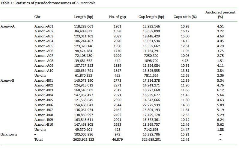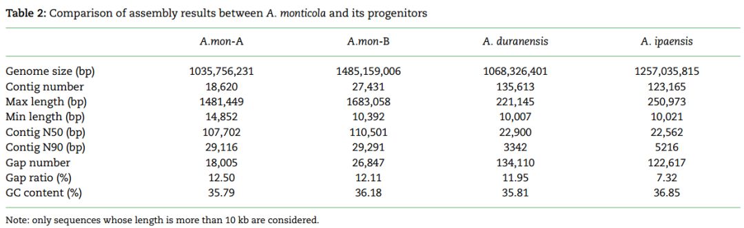 最終組裝出2.62Gb的基因組序列,保證組裝的完整性,又利用BioNano和Hi-C等方法對(duì)基因組進(jìn)行區(qū)分最終A.monticola得到的subgenome與祖先A基因組A.duranensis、祖先B基因組A.ipaensis之間的比較如表2所示,野生花生A and B subgenomes與對(duì)應(yīng)的基因組大小相近,基因組的完整性和連續(xù)性都有了顯著提升,為后續(xù)的功能基因組研究打下了堅(jiān)實(shí)的基礎(chǔ)。