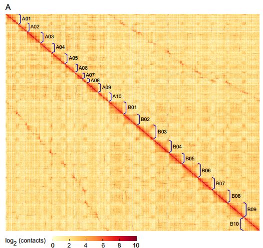????????除了常規(guī)基因組的評(píng)估手段之外,我們還利用更直觀的Hi-C對(duì)該基因組序列進(jìn)行準(zhǔn)確性評(píng)估,并與其祖先種A和祖先種B進(jìn)行了比較。比較栽培種A.monticola得到的subgenome與祖先A基因組A.duranensis, 祖先B基因組A.ipaensis的Hi-C熱圖,整體熱圖一致性非常高。(A圖是A.monticola的HiC熱圖,B圖祖先A基因組A.duranensis, 祖先B基因組A.ipaensis的Hi-C熱圖)