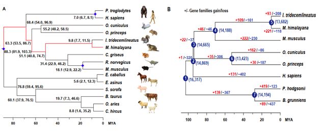 2.系統發育樹構建與分化時間估算:利用15個物種(小鼠,大鼠,倉鼠,喜馬拉雅旱獺,松鼠,鼠兔,兔子,人類,黑猩猩,山羊,綿羊,牛,豬,驢和馬)的4,573個單拷貝直系同源基因構建系統發育樹,MUSCLE,phyML,分化時間估算PAML MCMCtree;