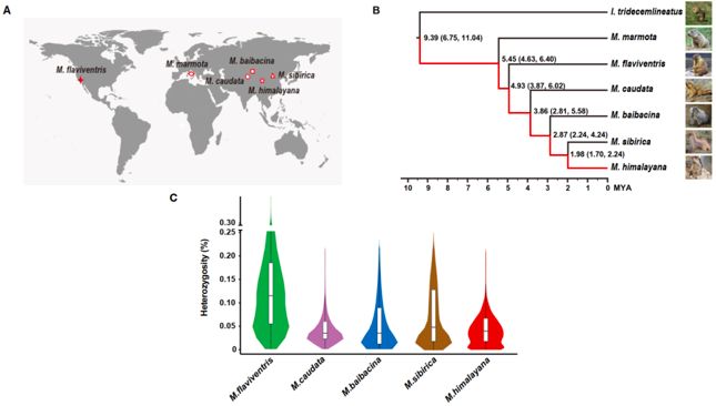 圖2、旱獺的地理位置,系統發育關系和雜合度分析