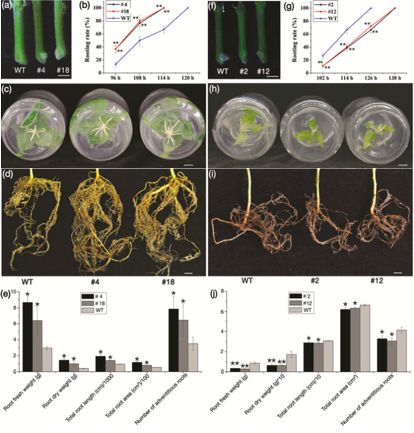 根在水和養分的獲取、維持植物地上生長中起著至關重要的作用。大多數單子葉植物和許多熱帶、溫帶濕樹林中存在天然的不定根。不定根形成的生物過程復雜多樣,按照時間階段可分為誘導、啟動、根原基激活和生長,不同階段均受到多種因素的影響,如遺傳背景、母本生理狀態、激素的應用和環境條件等。其中影響不定根發育的最重要的因子則為植物激素,而生長素則起了決定性作用。近年來,在擬南芥上的生長素對不定根的調控已經取得了巨大的科研成果,其可通過生長素信號網絡誘導不定根的萌發。研究表明,楊樹和擬南芥上對不定根的誘導和發育存在一定的相同點,但是將草本植物上不定根的研究成果應用于木本植物的可行性仍需要進一步的研究。