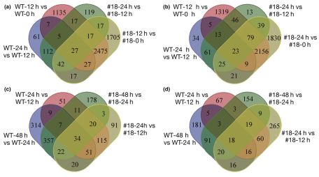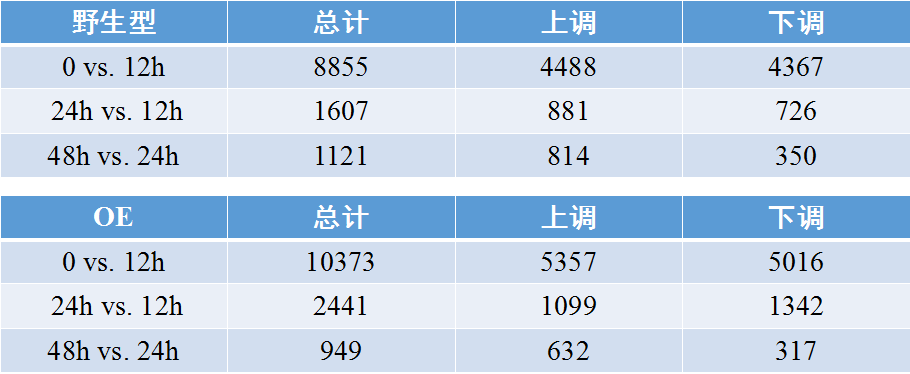 使用Illumina測序技術進行轉錄組分析從而鑒定影響不定根生成的差異表達基因。不論在野生型還是過表達植株里,0h與12h的差異表達基因均多于12h vs. 24h和24h vs. 48h比較組。因此,在不定根誘導和萌發的前12h發生了大量基因的重塑。OE植株在前12h增加1518個差異表達基因,其中有119個基因在野生型的12h vs. 24h中出現(圖3)。這些結果表明,PagFBL1基因的高表達會增強促進不定根形成的基因的表達變化。