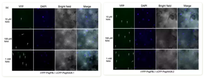使用雙分子熒光互補技術,將15個Aux/IAA基因共轉染到煙草葉片,發現只有在nYFP-PagFBL1與?cCFP-PagIAA28.1?和cCFP-PagIAA.28.2共轉染后(圖5a)才會發現YFP熒光蛋白信號,且生長素濃度越高,信號越強,而在其他組合中,只發現了DAPI信號(圖5b)。