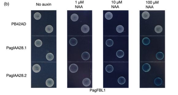 基于雙分子熒光互補研究結果,進一步進行酵母雙雜試驗。結果表明,PagFBL1和PagIAA28.1、PagIAA.28.2均有很強的結合,由此證明他們參與楊樹莖段不定根的誘導過程。