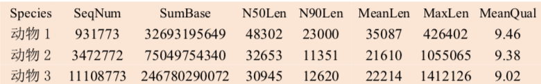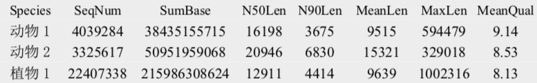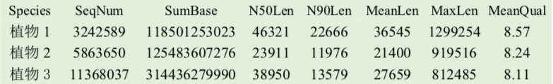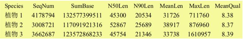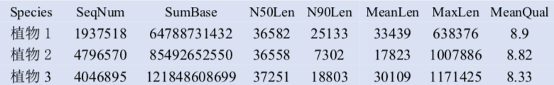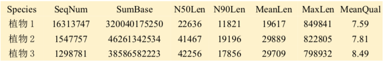 注:Species:分析的物種信息;SeqNum:各個長度范圍內序列的數目;SumBase:指各個長度范圍內序列的總長度;N50Len:reads N50長度;N90Len:readsN90長度;MeanLen:平均reads長度;MaxLen:最長reads長度;MeanQual:質量值,準確度=1-10^(-Q/10)
