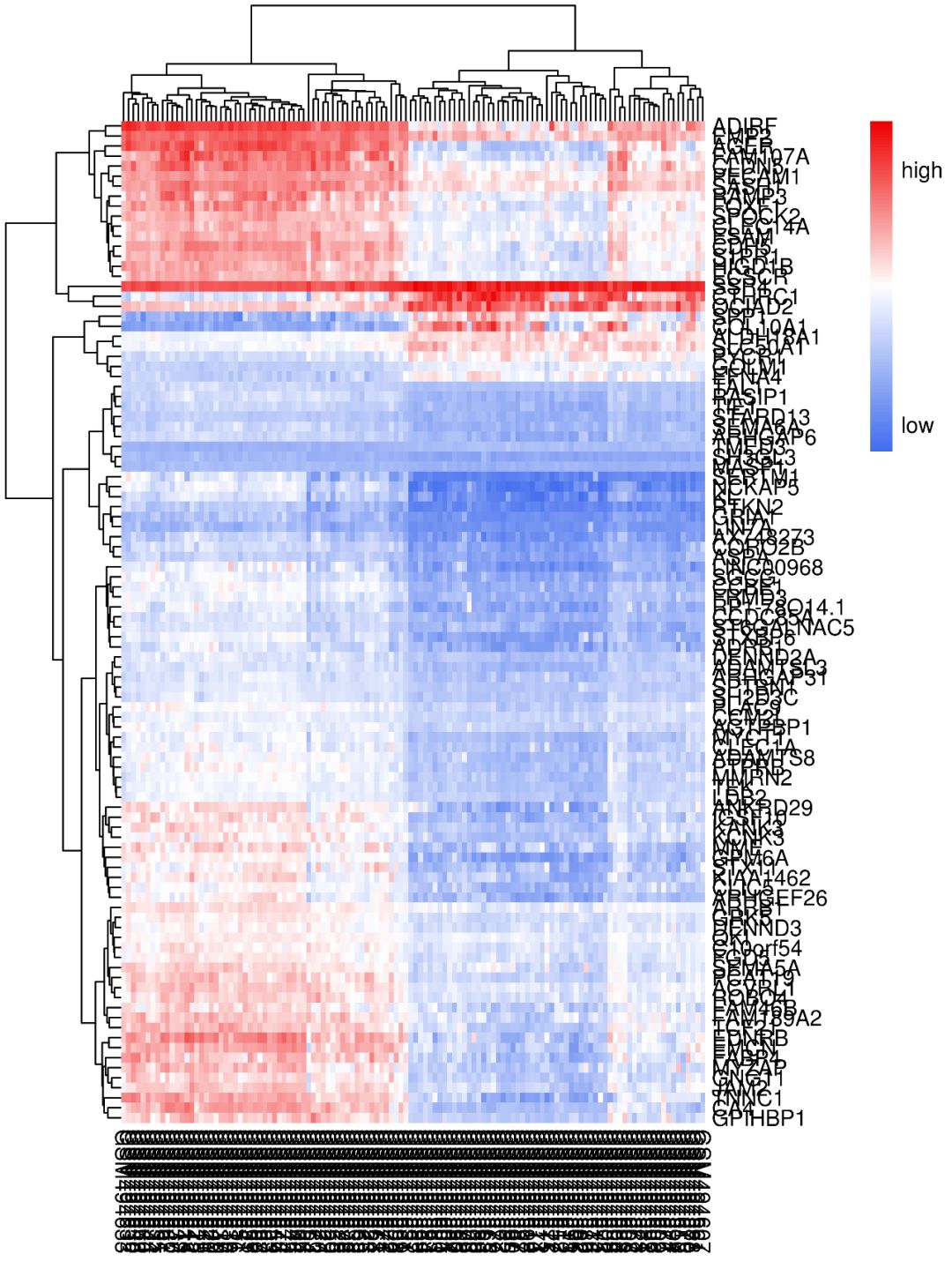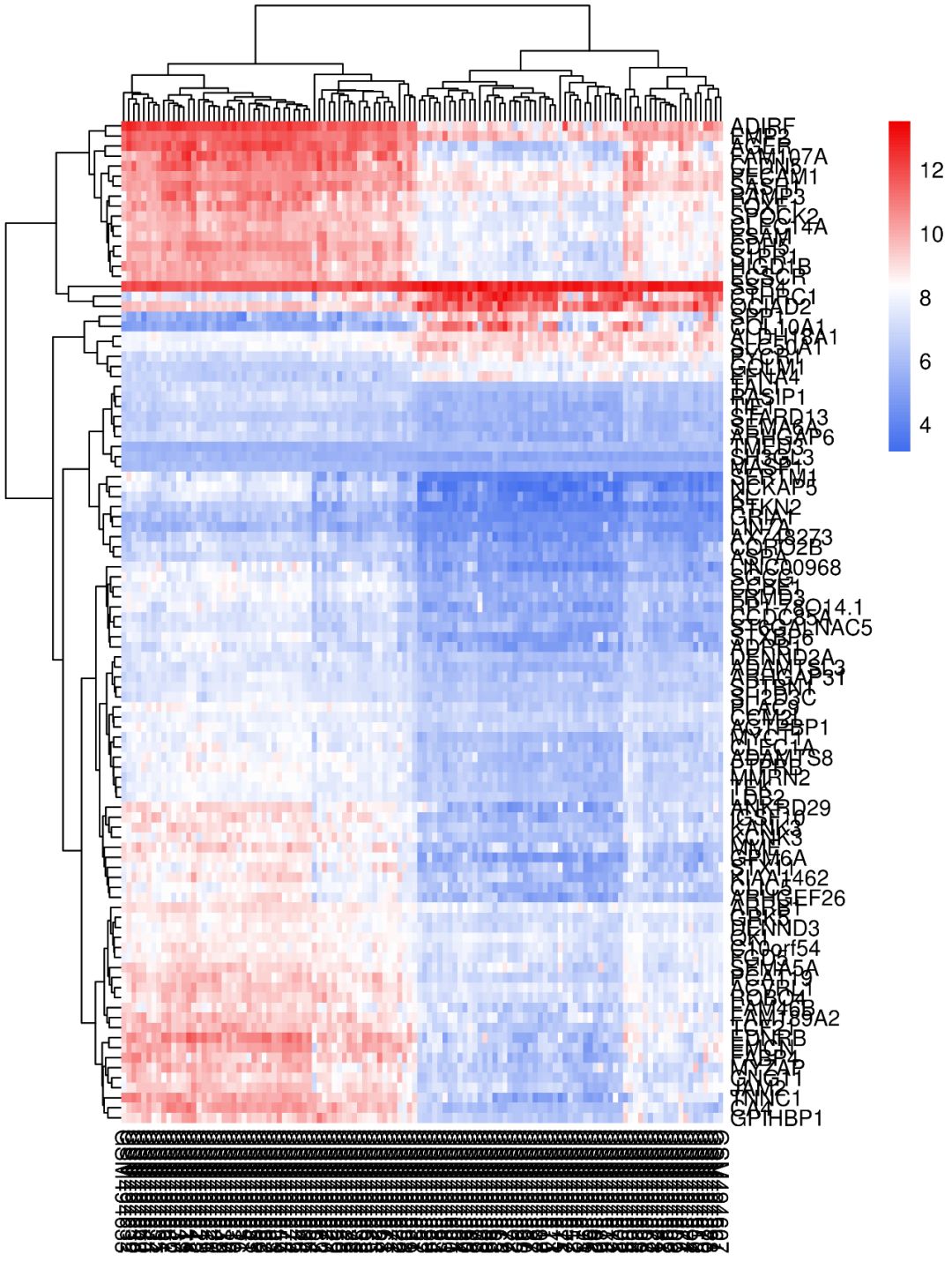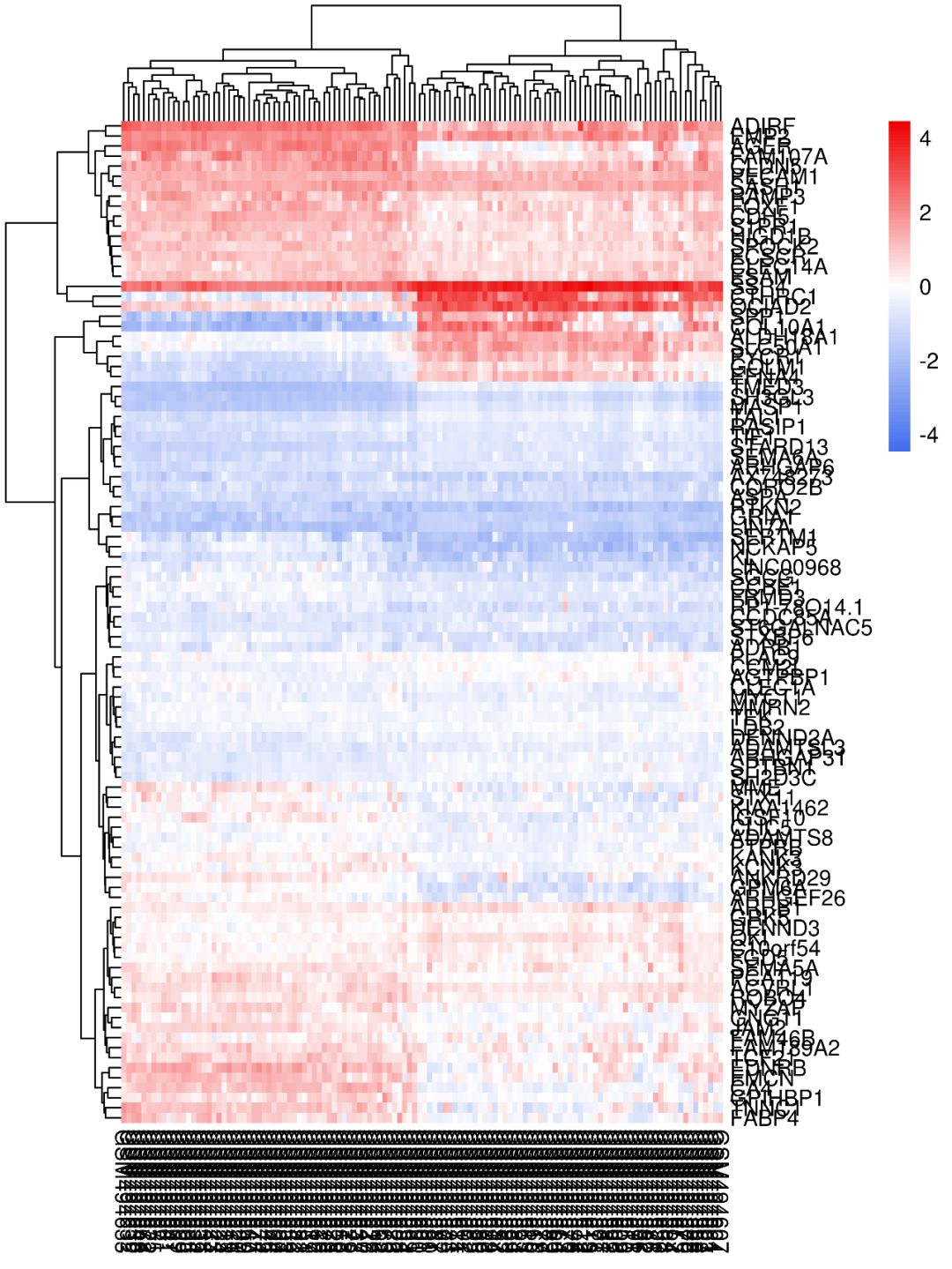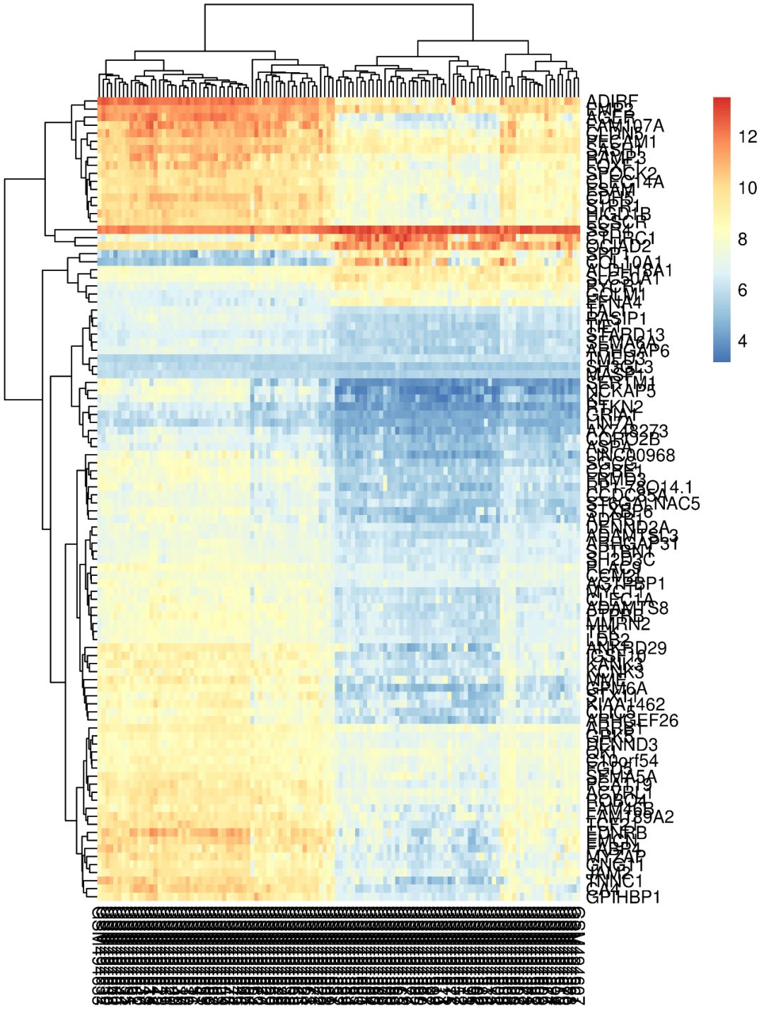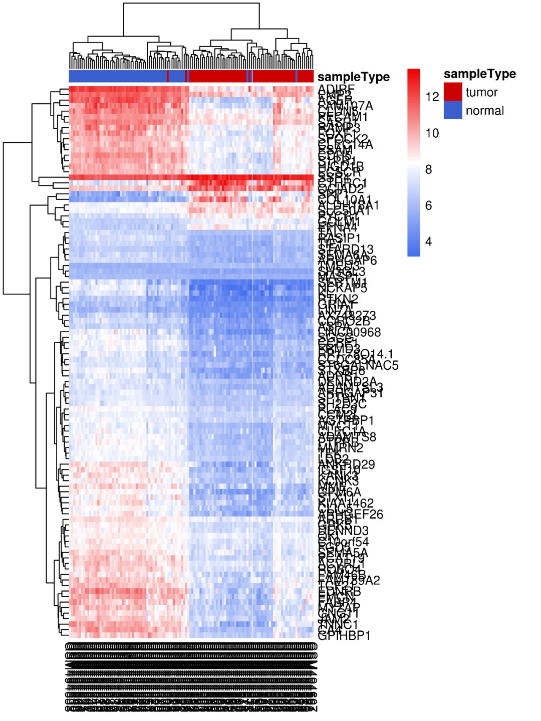 如使用默認參數畫出來的熱圖,是不是很不好看?基因名和樣本名亂成一堆,也看不出來那些樣本聚類到了一起…這類熱圖怎么做?