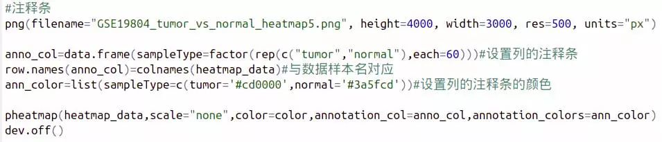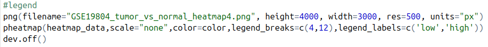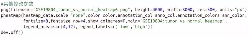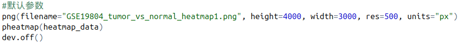 我們修改了字體大小,不顯示樣本名,以及設置圖片標題,到此時,經過一系列參數更改,是不是已經比一開始使用默認參數好看多了呢?(可以增加一個對比圖,GSE19804_tumor_vs_normal_heatmap6.png與GSE19804_tumor_vs_normal_heatmap1.png的 對比)。