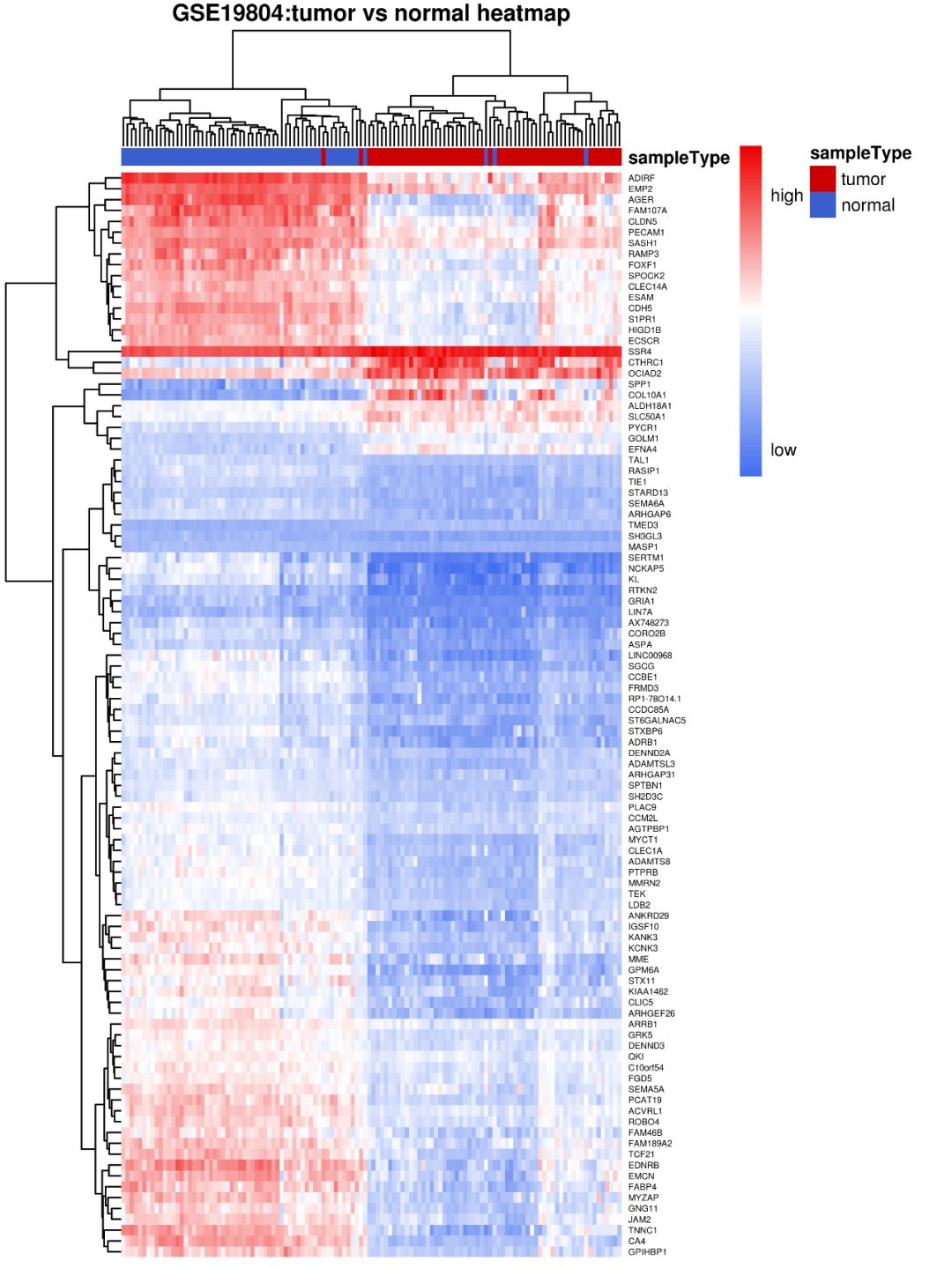 此次例子,我們選擇了一套GEO數據庫的肺癌數據,數據編號為GSE19804,120個樣本,其中包含60個癌癥樣本和60個癌旁正常樣本,前面我們使用t檢驗,并對p值進行BH校正,篩選fdr小于0.01的基因中前100個在癌癥相對于正常樣本中顯著差異表達的基因進行熱圖繪制。