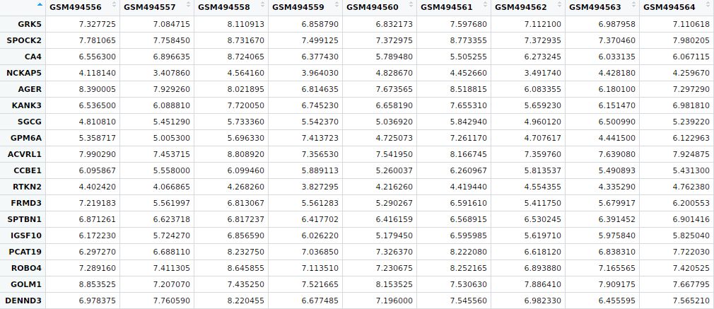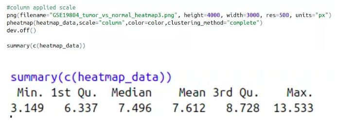 我們現在將數據進行行均一化,聚類方法選擇complete,進行均一化之后的熱圖還沒有前面的好看,查看數據表達情況,我們發現最小的表達值3.149和最大的表達值13.533之間并沒有相差很大,因此這套數據其實不適合做均一化處理,畫出來的熱圖更好看。