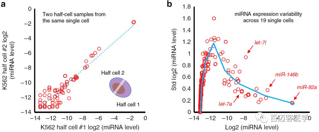 2、通過將miRNA水平與19個表型相同的單細胞中預測的靶mRNA的表達關聯起來,觀察到預測的靶標與大量表達的miRNA變化顯著負相關。表明單獨的microRNA表達變異性可能導致非遺傳性細胞間異質性。