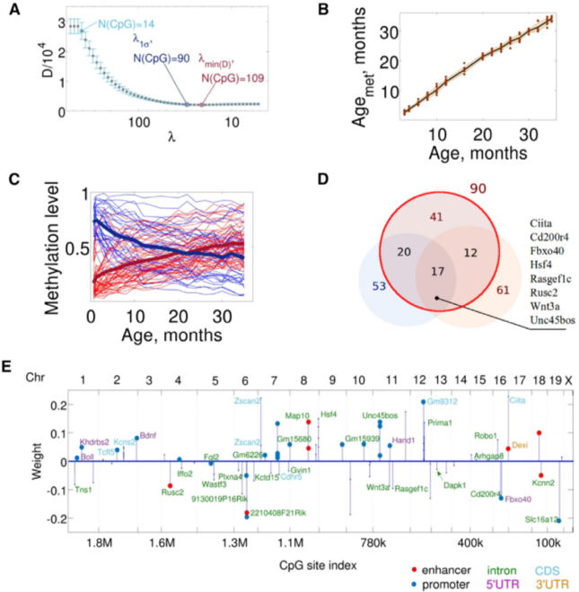 該研究對不同年齡階段的小鼠進行RRBS研究,并找到了90個與年齡相關的CpG位點來構建小鼠生物學年齡的預測器。這些位點的clock代表了衰老的生物標志物,并可以用來確定生物體的生物學年齡,并進一步干預衰老的速度。