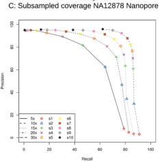 對于Nanopore的數據,在20X的覆蓋度時就能達到82.24%的準確率和84.23%的識別率。不過這可能是因為ONT數據只測了28X。