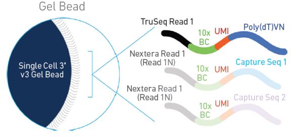 1)將制備好的單細(xì)胞懸浮液與含有barcode信息的凝膠珠以及酶的混合物結(jié)合,然后在微流體“雙十字”中進(jìn)行液滴包裹,從而形成GEMs(Gel Bead-In-EMulsions),有效GEMs中包含膠珠(膠珠中有預(yù)制的10x引物)、單細(xì)胞、和Master Mix。然后,在GEMs內(nèi)進(jìn)行細(xì)胞裂解和逆轉(zhuǎn)錄反應(yīng)。有效GEMs中,10X Barcode將與cDNA產(chǎn)物連接在一起,接下來再將GEMs破碎并打碎油滴,以cDNA為模板進(jìn)行PCR擴(kuò)增,cDNA擴(kuò)增完成以后,針對(duì)擴(kuò)增產(chǎn)物進(jìn)行質(zhì)檢(擴(kuò)增片段大小以及擴(kuò)增產(chǎn)物的產(chǎn)量)。