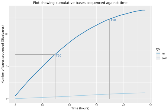上述分析完成后會將分析結果存放至HTML文件,可用瀏覽器打開Nanopore_SumStatQC_Tutorial.html進行查看。對單個芯片約1M reads分析的部分結果展示如下(結果來自教程,堿基識別使用Guppy 2.1.3,根據識別序列的平均質量值將其分為pass和fail兩種,質量值閾值默認為7):