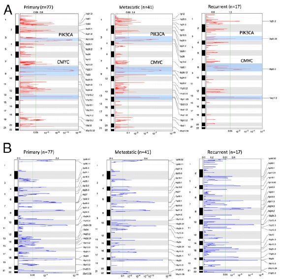 成對外顯子測序數據SCNA分析表明,在原發灶與復發灶匹配的17名患者中,4名患者獲得了PIK3CA擴增(3q26),2名患者在復發腫瘤中獲得了c-MYC擴增(8q23-24)。GISTIC分析表明,PIK3CA和c-MYC擴增在樣本間具有顯著重現性,其頻率在復發灶、轉移灶和原發灶依次降低。