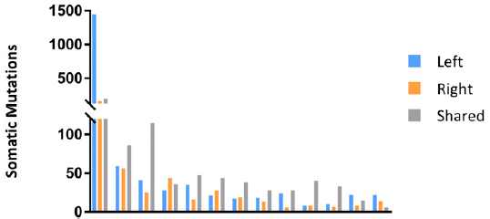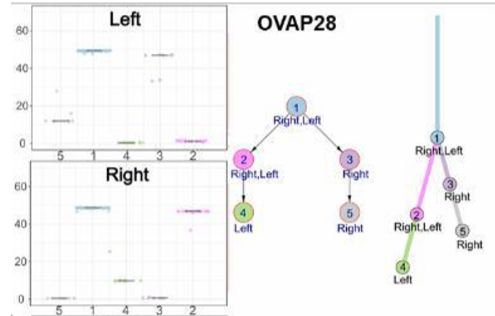 2、研究者也對13對雙側卵巢癌(synchronous bilateral ovarian cancer,SBOC)進行了測序,評估腫瘤克隆進化,以確定左右兩側腫瘤是否獨立地作為2個不同的腫瘤,還是分別代表原發性和轉移性腫瘤。分析表明,體細胞突變在2側腫瘤廣泛共享,所有病例中均顯示2側腫瘤起源于共同的祖先。