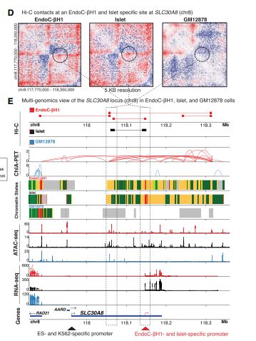 多組學分析結果在不同細胞中的比較。Hi-C互作表明在 EndoC-bH1 和人原代胰島SLC30A8位點有特異性loop,但在GM12878中缺乏。