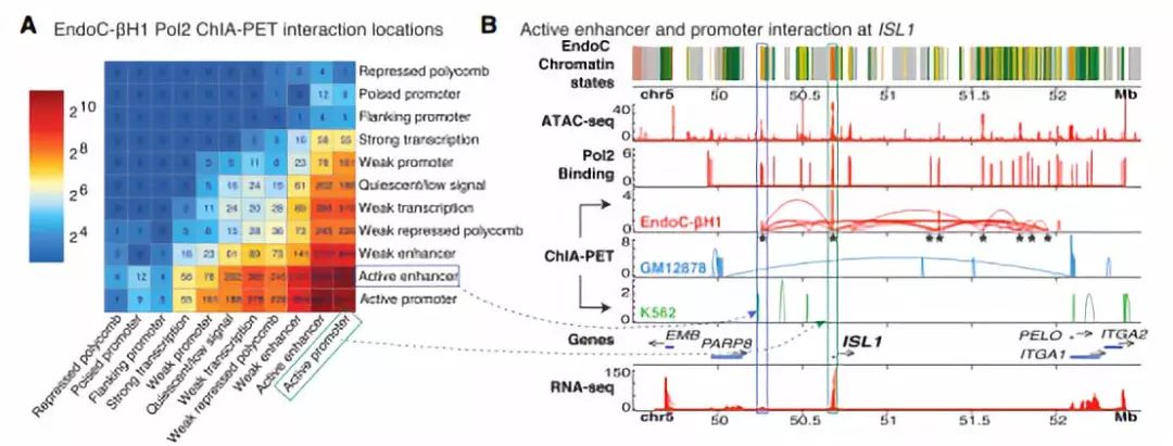 為示意功能性順式調控網絡,文中在EndoC-bH1中采用RNA聚合酶(Pol2)ChIA-PET,鑒定了25,336個推定的Pol2介導的染色質互作。進一步過濾,與ATAC-seq OCRs取交集,得到16,756個互作,大多數與活性增強子和啟動子關聯。且與已在人胰島中報道過的互作一致,包括 ISL1和PDX1位點。