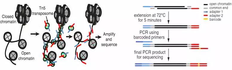 ATAC-seq:Assayfor Transposase-Accessible Chromatin with high throughput sequencing(使用高通量測序對Tn5轉座酶易接近性核染色質區域進行測序分析),由美國加利福尼亞州斯坦福大學研究人員于2013年提出,是一種表觀遺傳學研究技術,通過轉座酶對某種特定時空下開放的核染色質區域進行切割,獲得在該時空下基因組中所有活躍轉錄的調控序列。通過ATAC-seq研究可以得到全基因組上處于開放狀態的染色質區域,進一步定位核小體及相關調控元件。