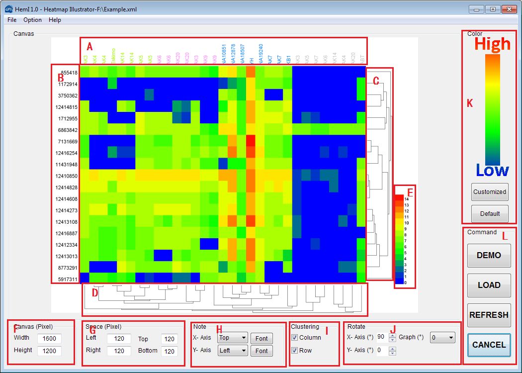點擊L框中的LOAD按鈕即可打開要生成heatmap的文件,excel格式也可以。X-axis title是選擇橫軸坐標對應到輸入文件的哪一行,選擇auto select自動選擇矩陣數據。